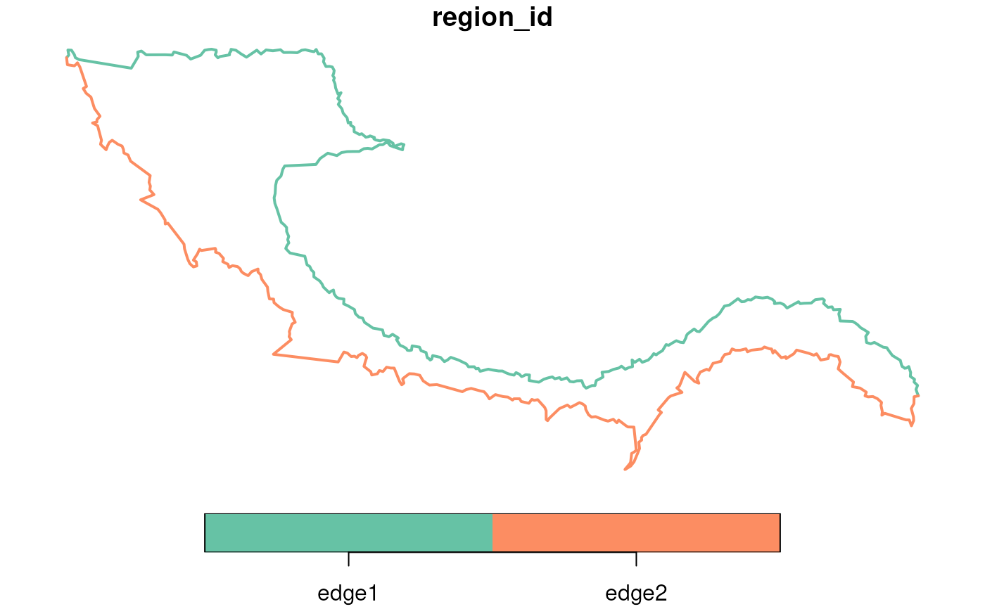An sf object with two LINESTRING features and a 'region_id' column indicating edge1 and edge2.